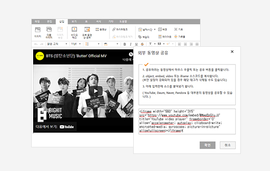 • 유튜브나 네이버 등의 동영상은 물론, 아이프레임 등의 객체도 쉽게 삽입이 가능합니다.