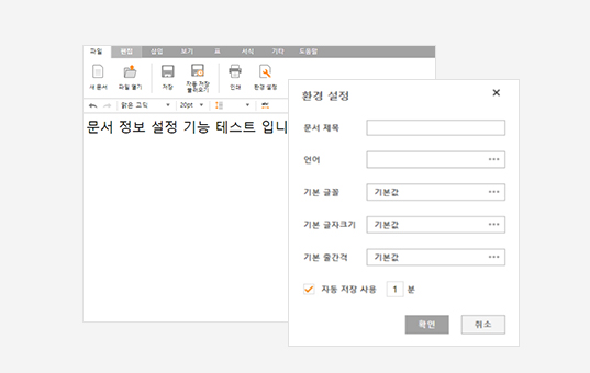 • 문서정보 설정 화면에서 자동 저장되는 간격을 분 단위로 설정할 수 있습니다.