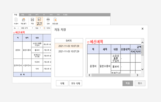 • 에디터 사용 중 갑작스러운 브라우저 종료로 인한 문서의 망실을 막기 위해 자동 저장 기능을 지원합니다.